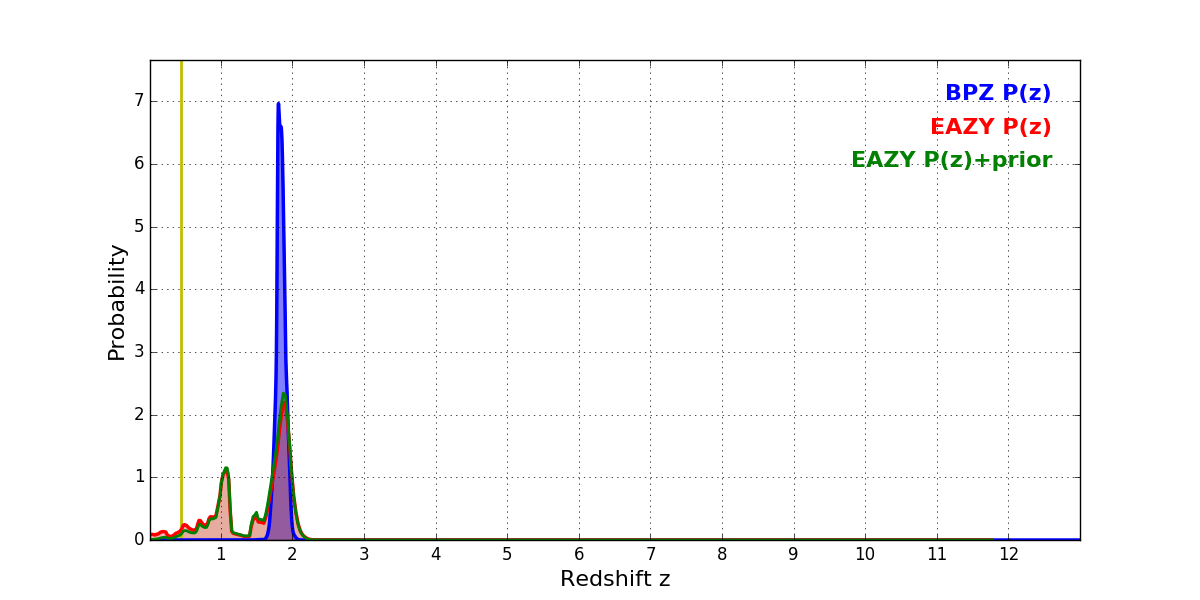 In P(z) plots: Yellow lines mark the cluster redshift z = 0.438,