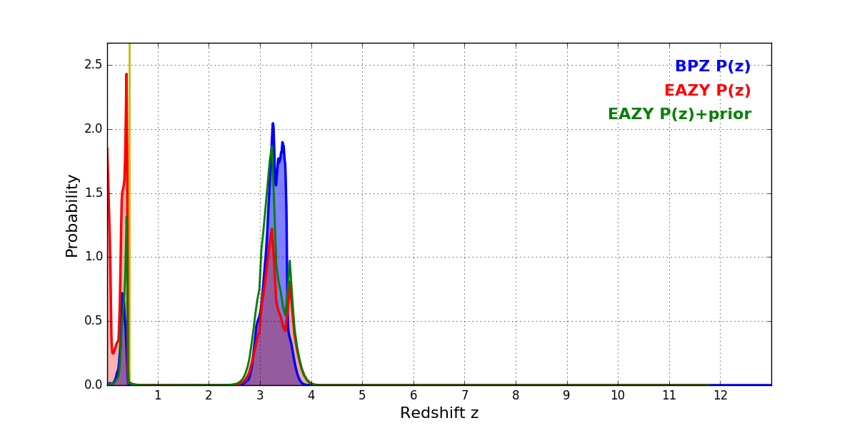 In P(z) plots: Yellow lines mark the cluster redshift z = 0.438,