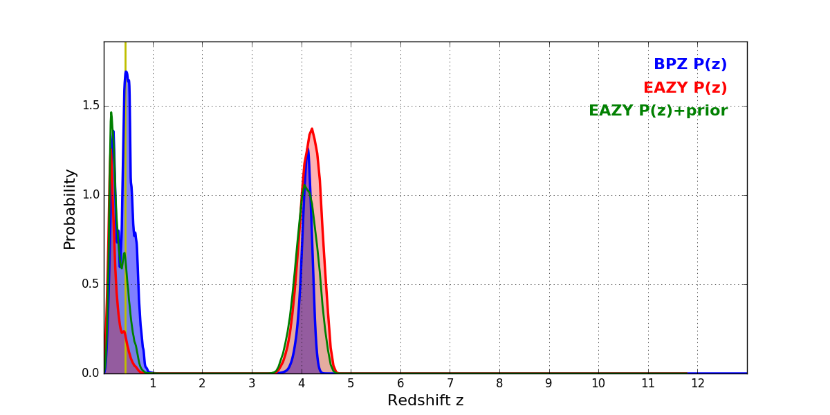 In P(z) plots: Yellow lines mark the cluster redshift z = 0.438,