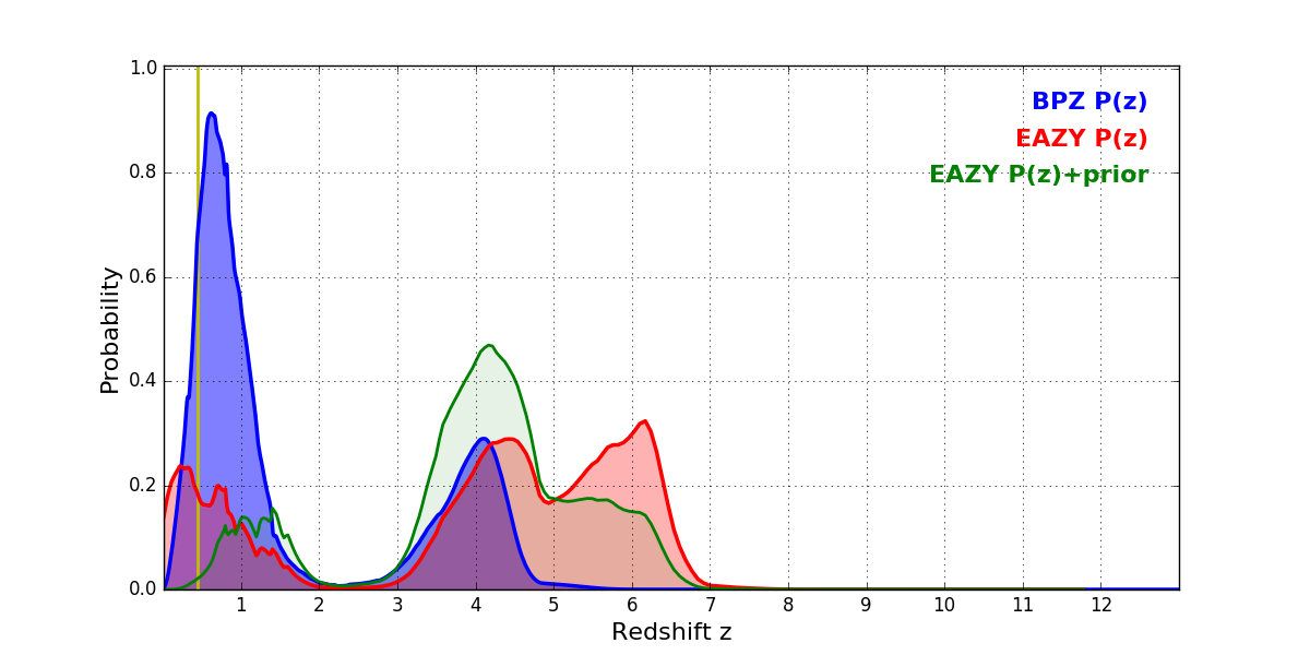 In P(z) plots: Yellow lines mark the cluster redshift z = 0.438,
