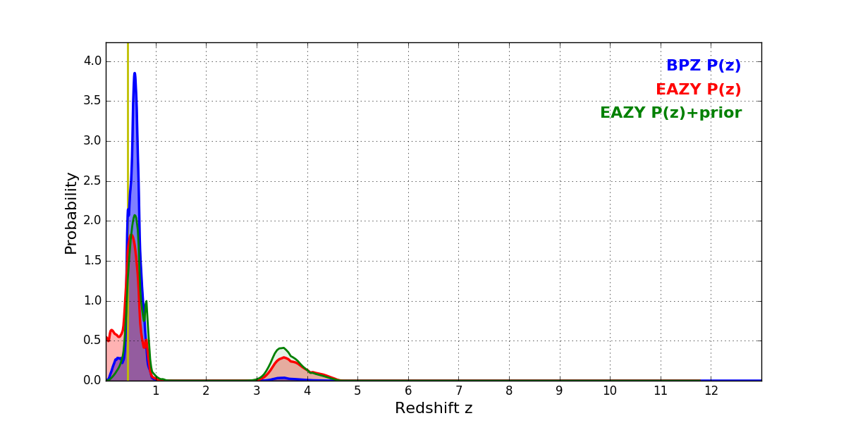In P(z) plots: Yellow lines mark the cluster redshift z = 0.438,
