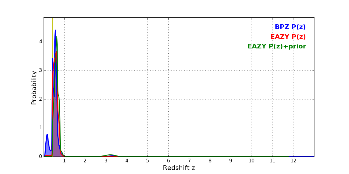 In P(z) plots: Yellow lines mark the cluster redshift z = 0.438,