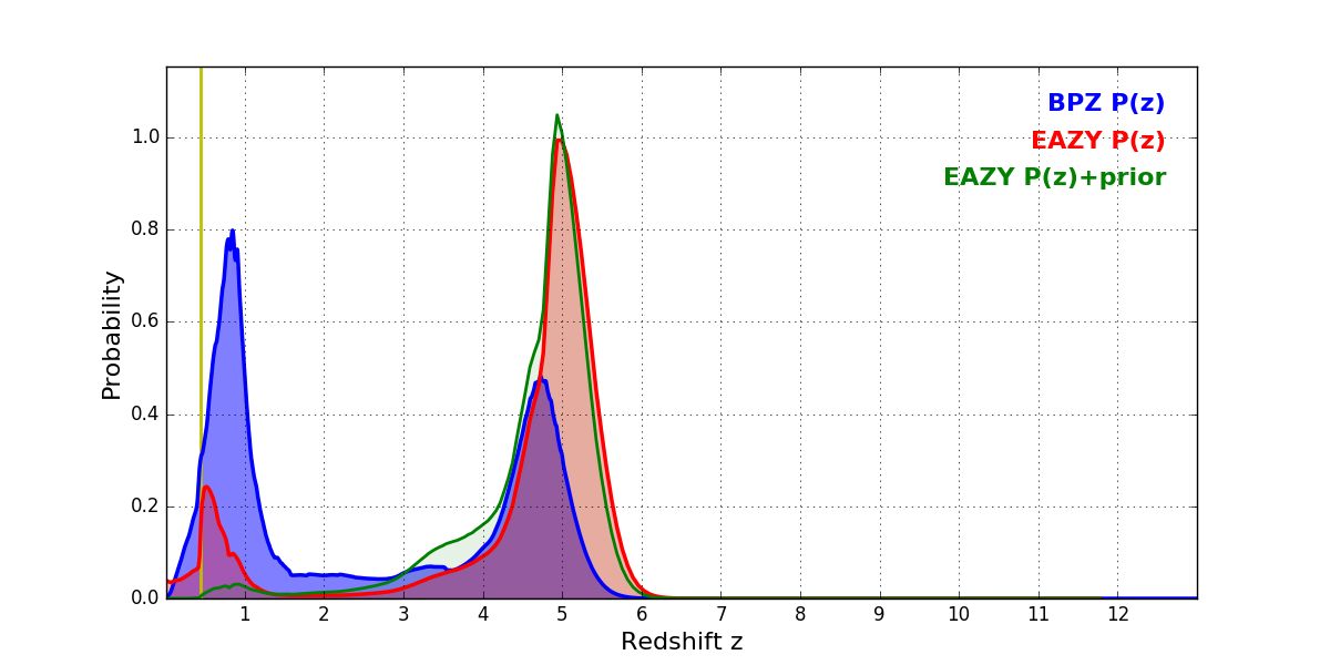 In P(z) plots: Yellow lines mark the cluster redshift z = 0.438,
