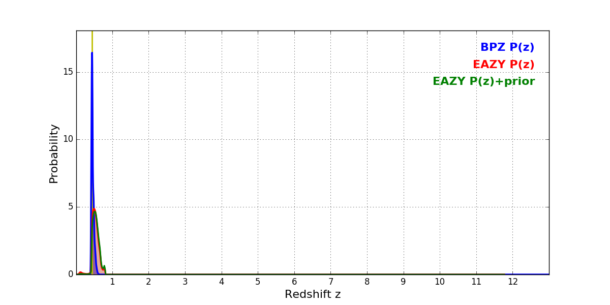 In P(z) plots: Yellow lines mark the cluster redshift z = 0.438,