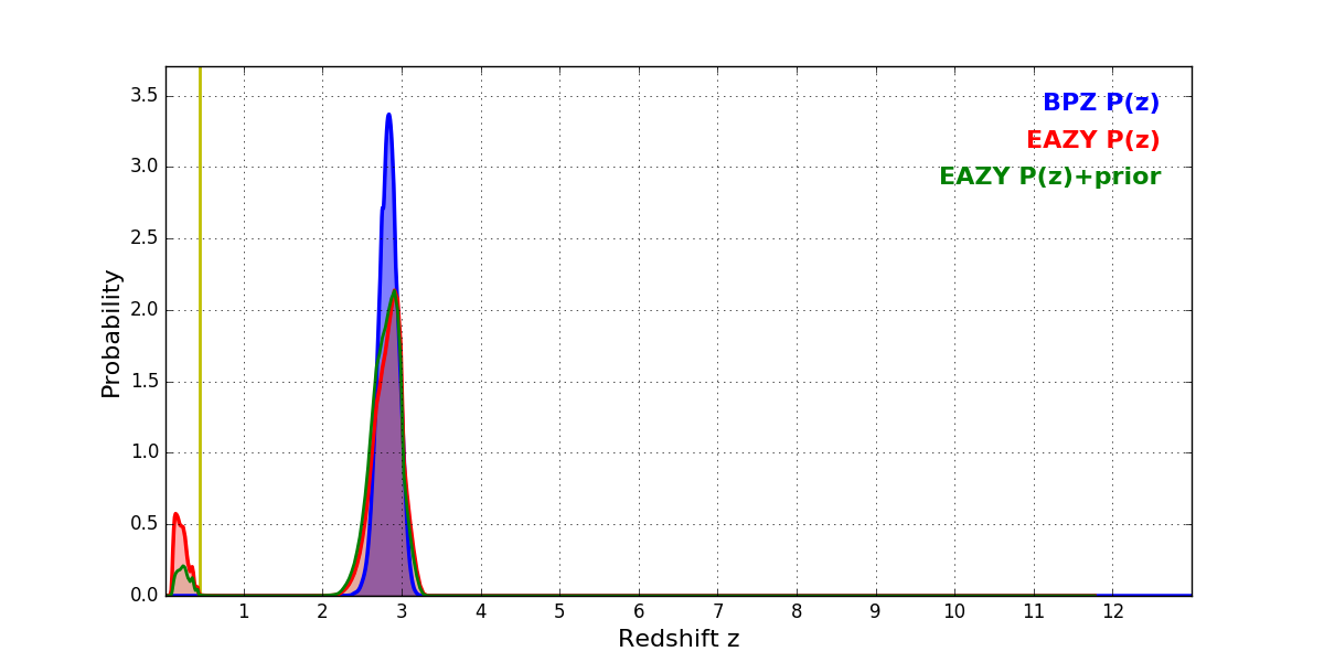 In P(z) plots: Yellow lines mark the cluster redshift z = 0.438,