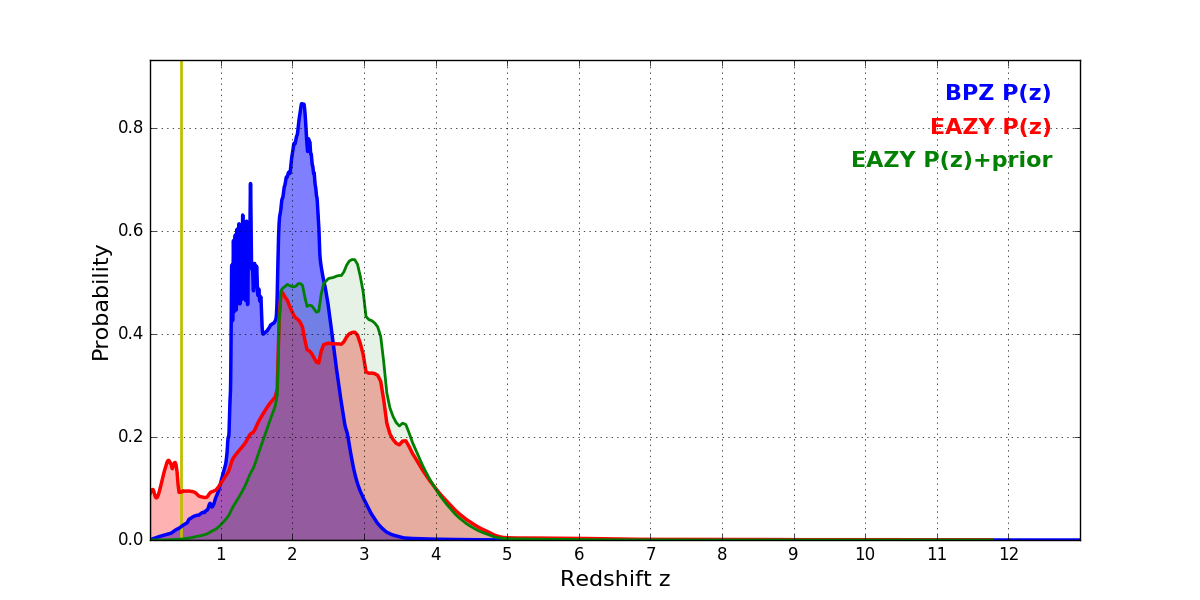 In P(z) plots: Yellow lines mark the cluster redshift z = 0.438,