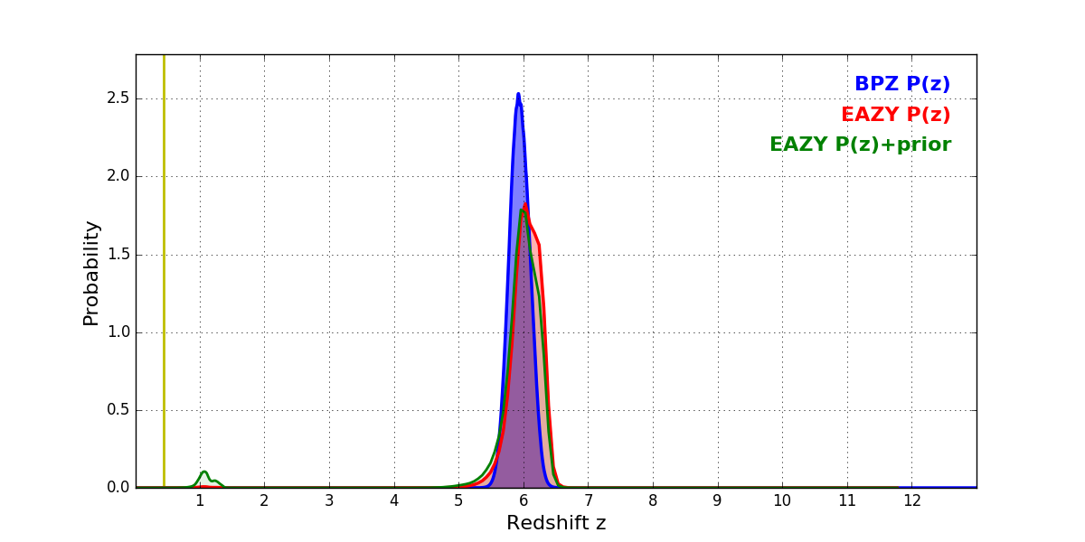 In P(z) plots: Yellow lines mark the cluster redshift z = 0.438,