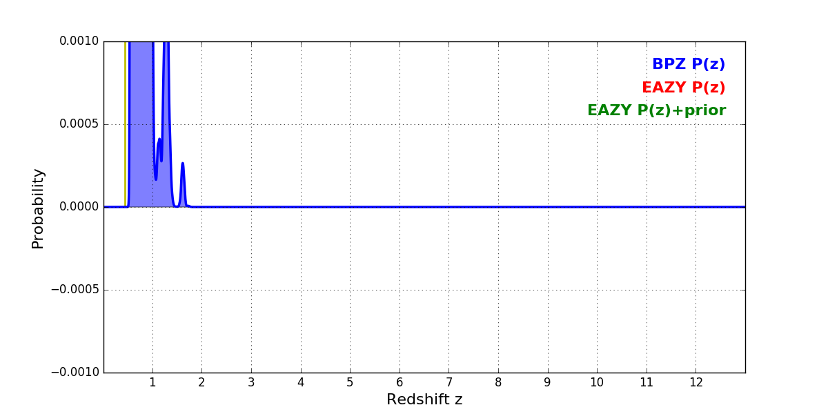 In P(z) plots: Yellow lines mark the cluster redshift z = 0.438,
