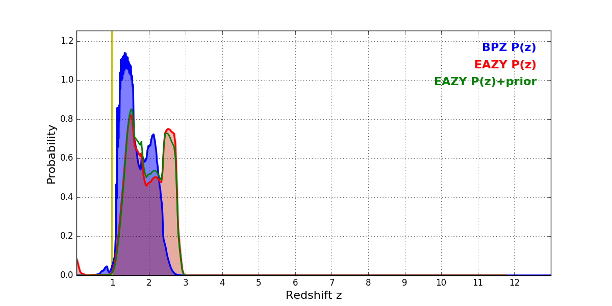 In P(z) plots: Yellow lines mark the cluster redshift z = 0.972,