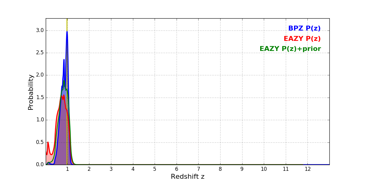 In P(z) plots: Yellow lines mark the cluster redshift z = 0.972,