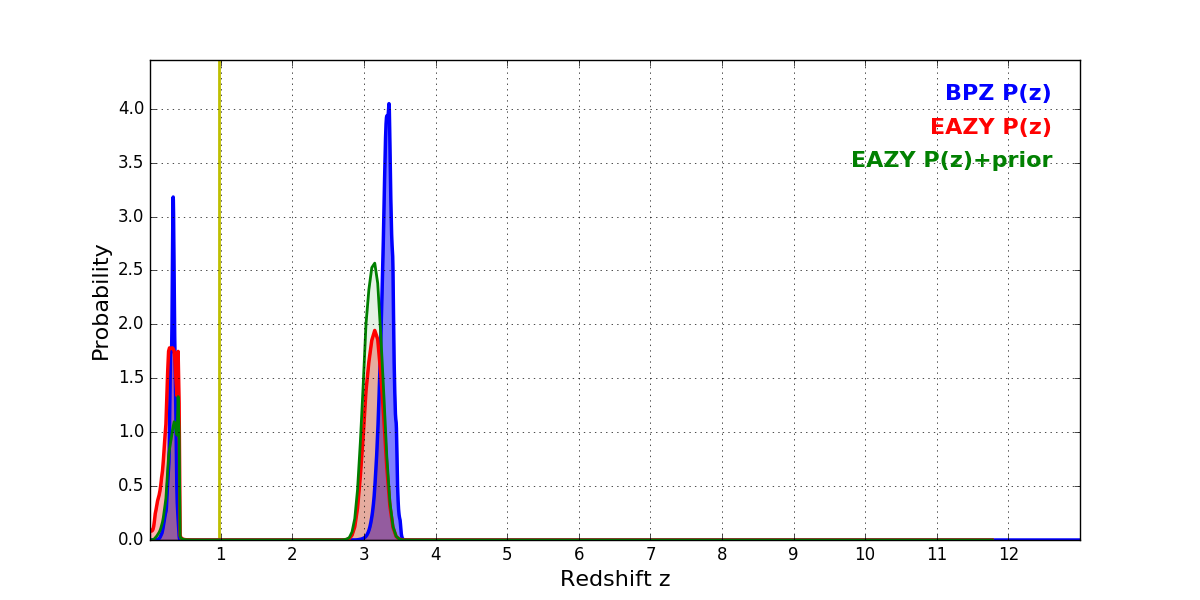 In P(z) plots: Yellow lines mark the cluster redshift z = 0.972,