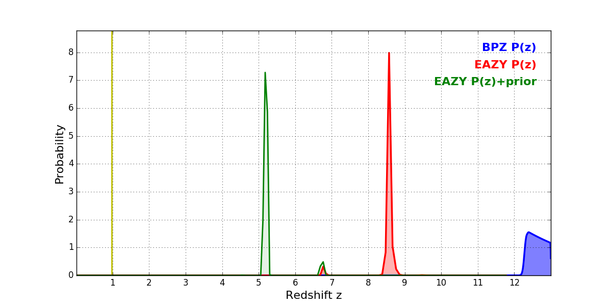 In P(z) plots: Yellow lines mark the cluster redshift z = 0.972,