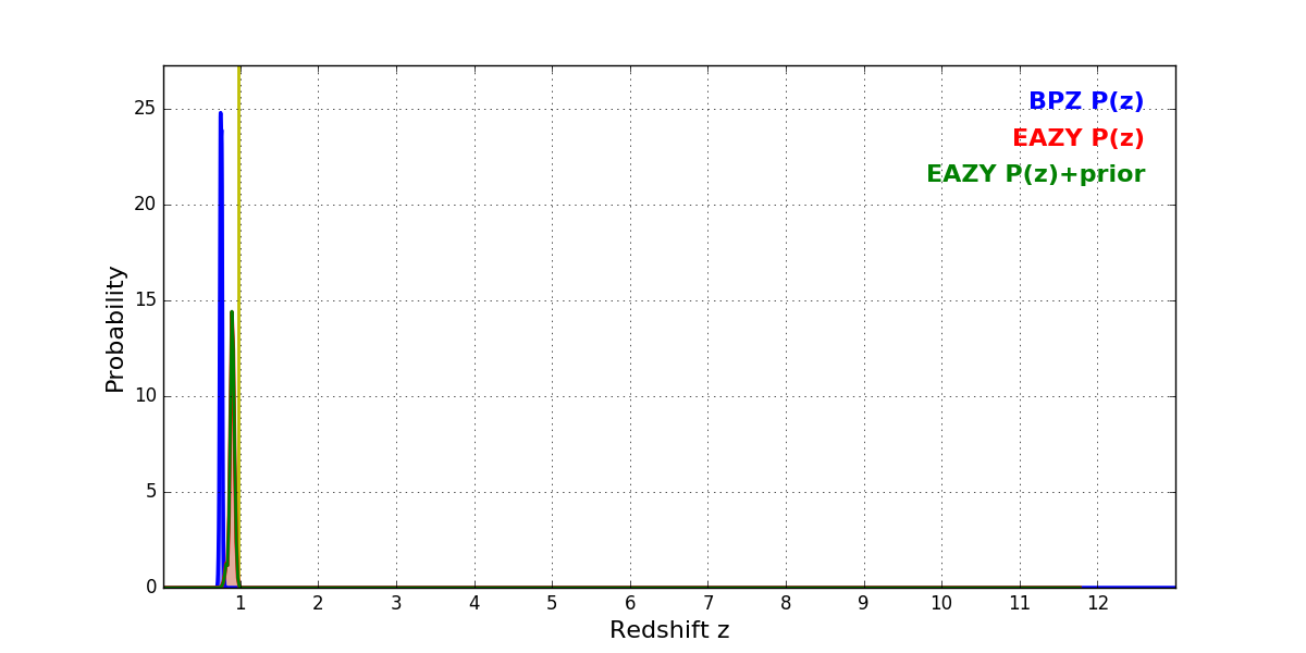 In P(z) plots: Yellow lines mark the cluster redshift z = 0.972,