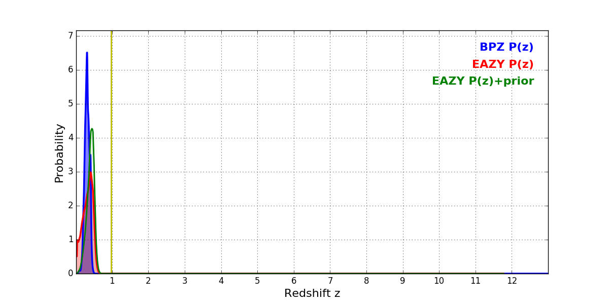 In P(z) plots: Yellow lines mark the cluster redshift z = 0.972,
