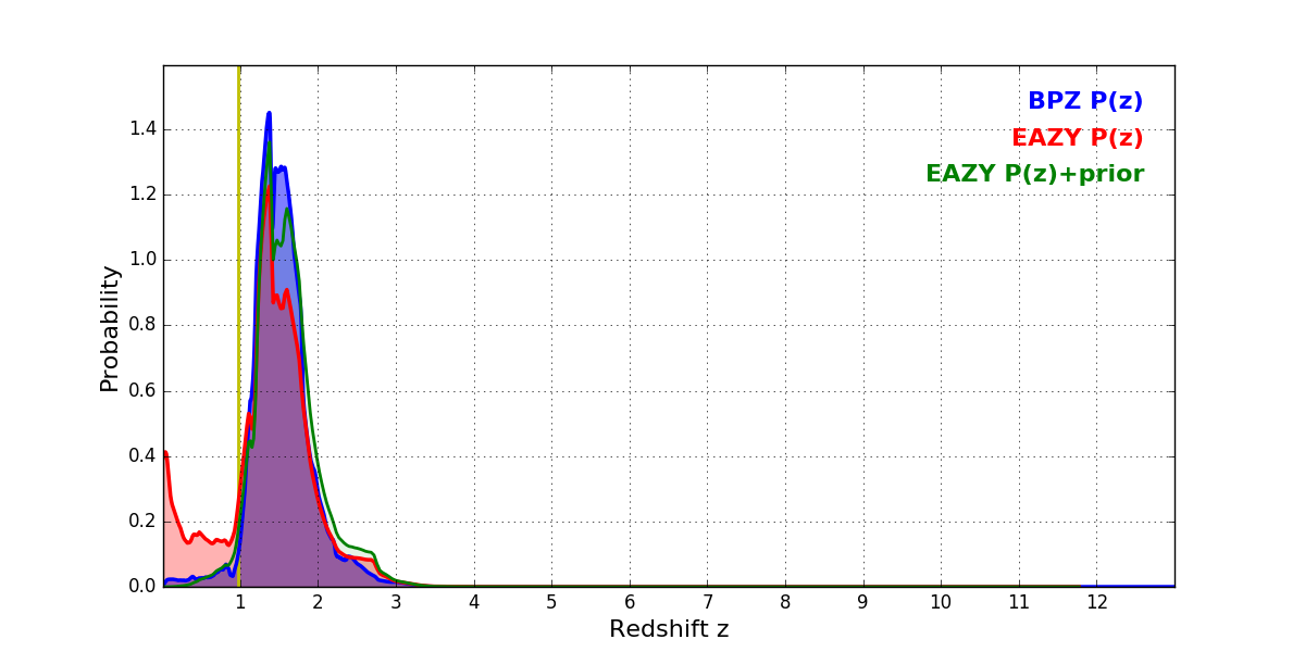 In P(z) plots: Yellow lines mark the cluster redshift z = 0.972,