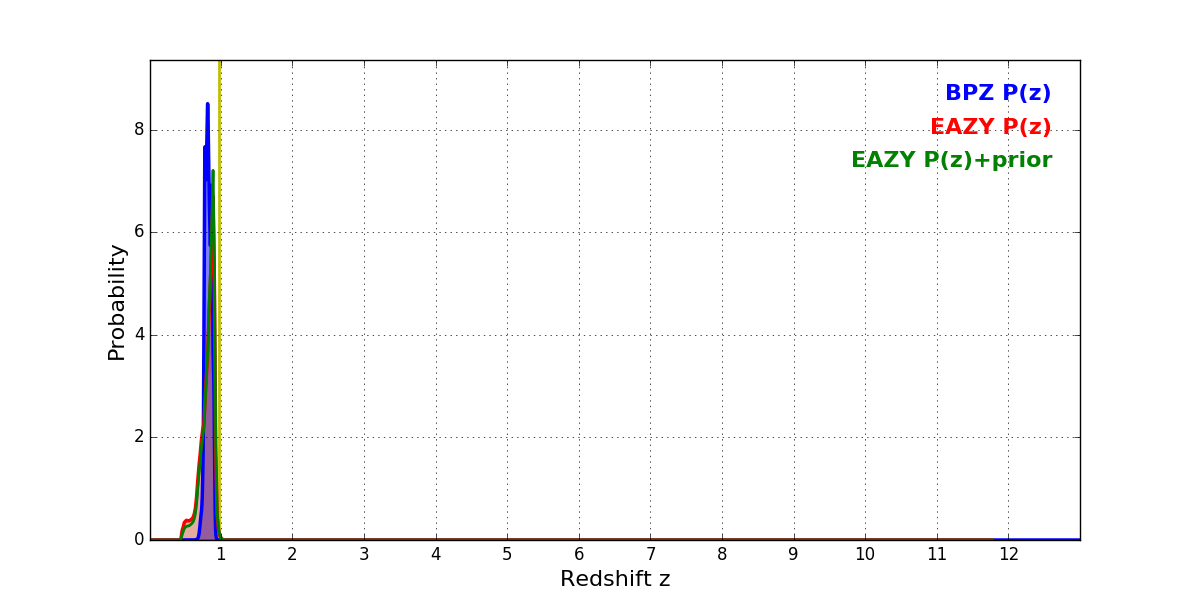 In P(z) plots: Yellow lines mark the cluster redshift z = 0.972,