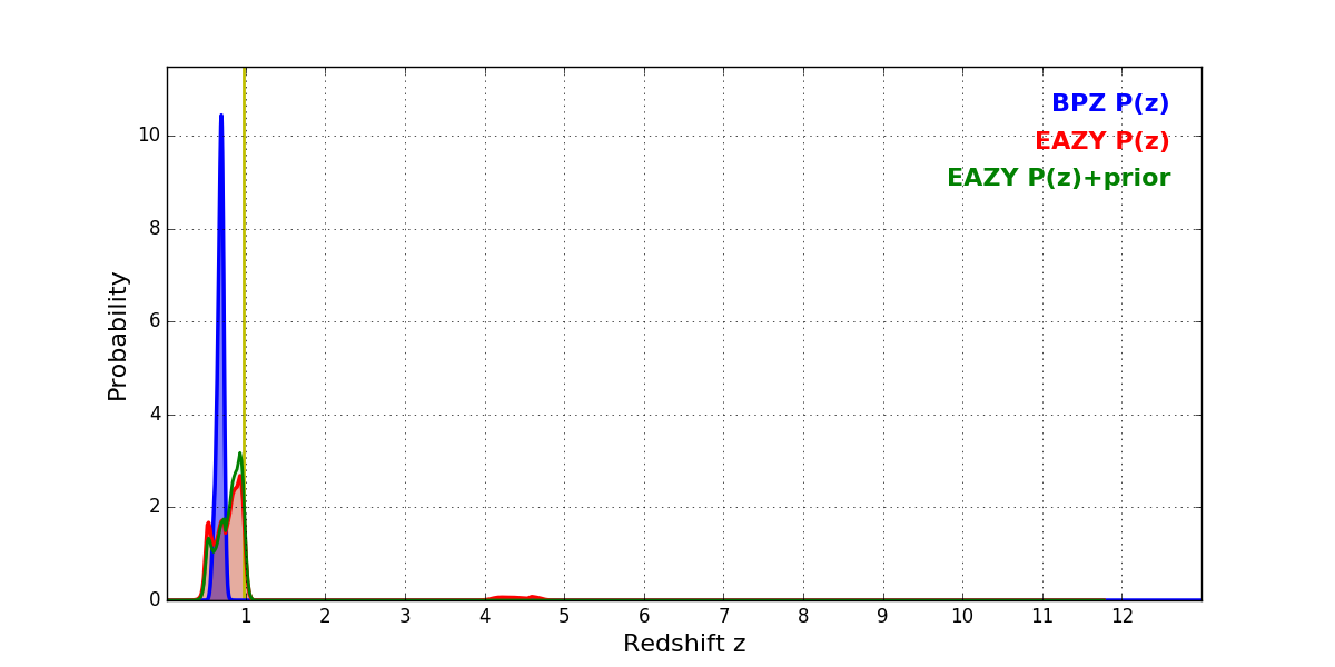 In P(z) plots: Yellow lines mark the cluster redshift z = 0.972,