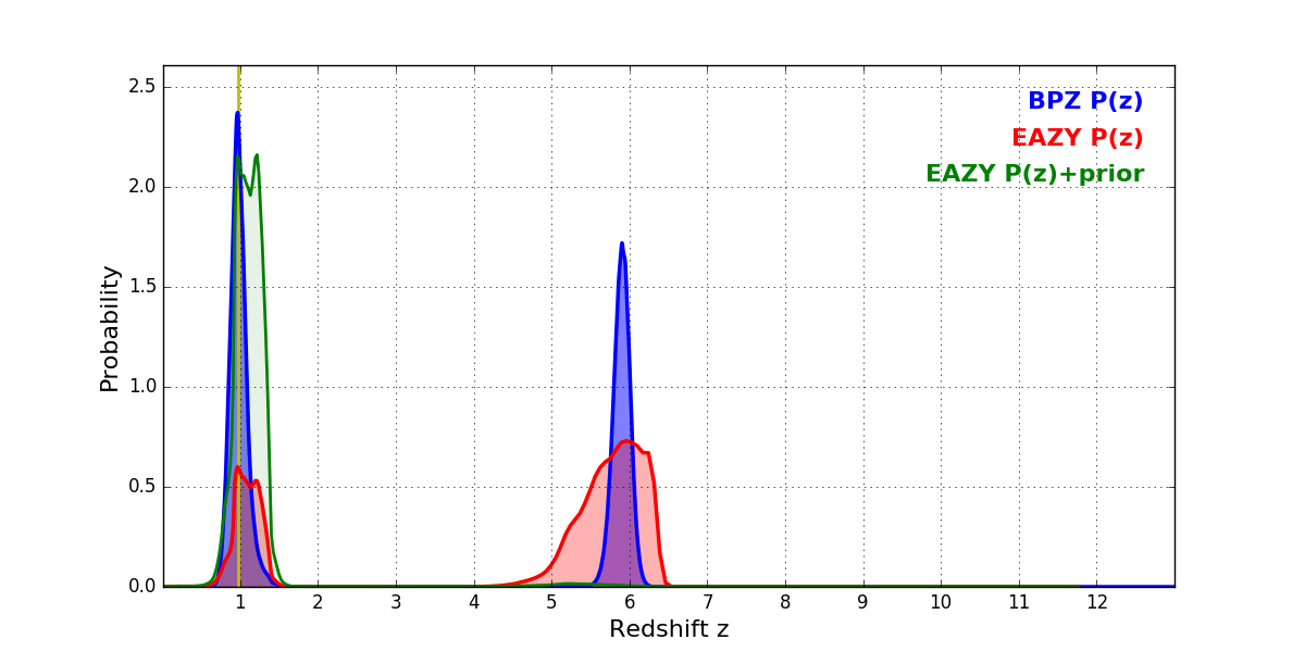 In P(z) plots: Yellow lines mark the cluster redshift z = 0.972,