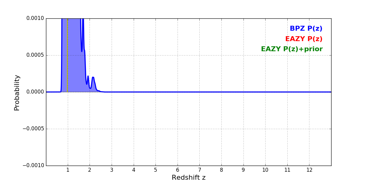 In P(z) plots: Yellow lines mark the cluster redshift z = 0.972,