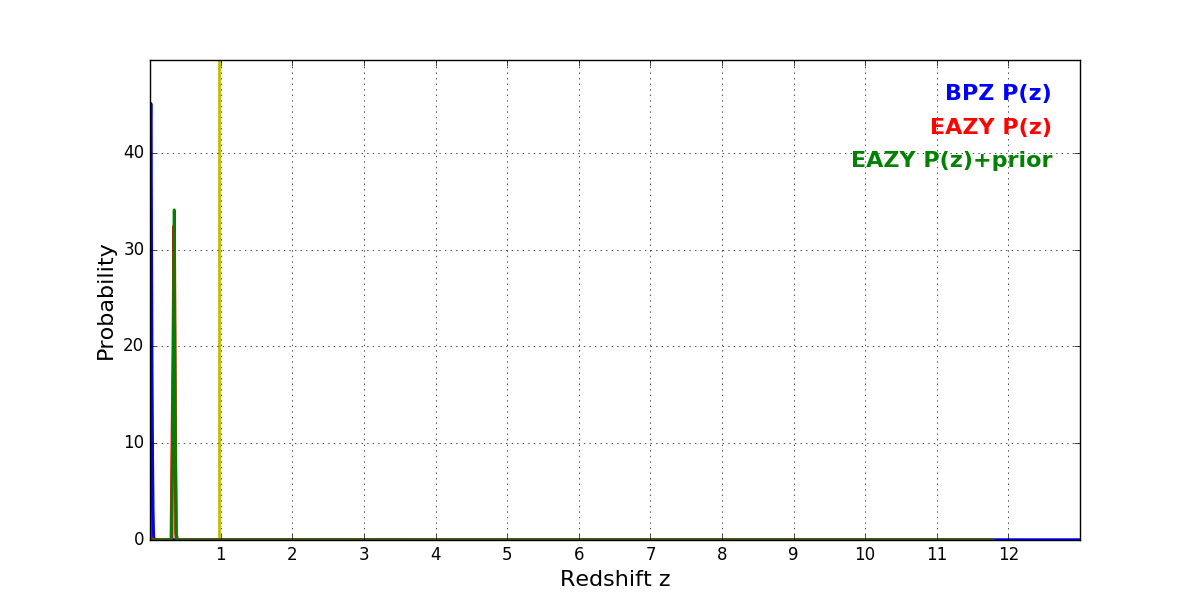 In P(z) plots: Yellow lines mark the cluster redshift z = 0.972,