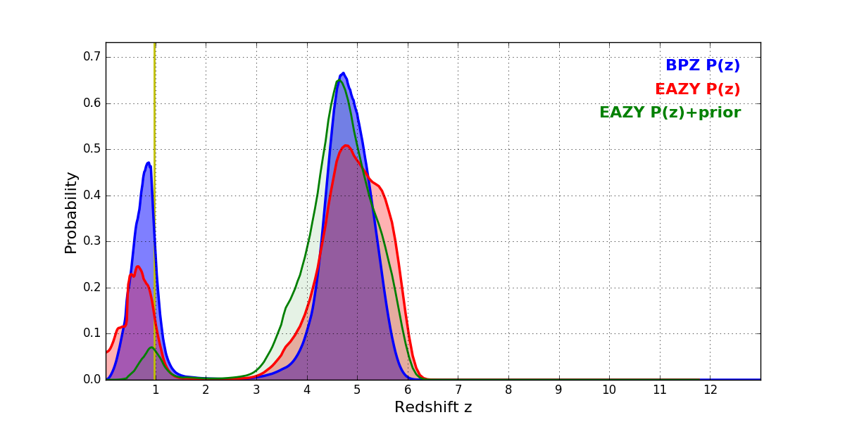 In P(z) plots: Yellow lines mark the cluster redshift z = 0.972,