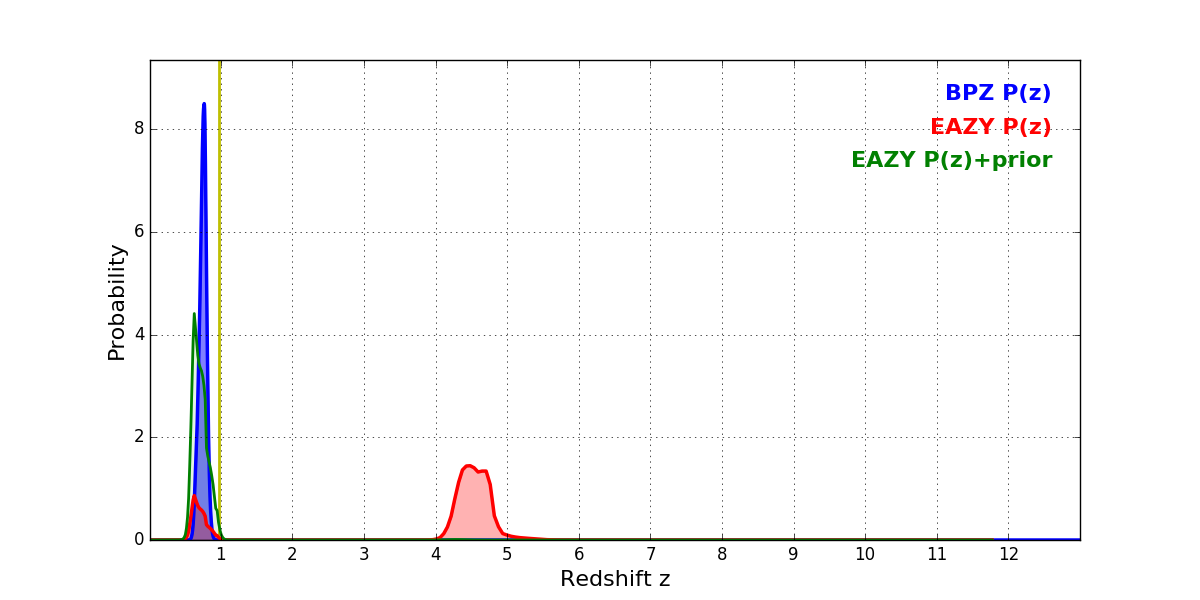 In P(z) plots: Yellow lines mark the cluster redshift z = 0.972,