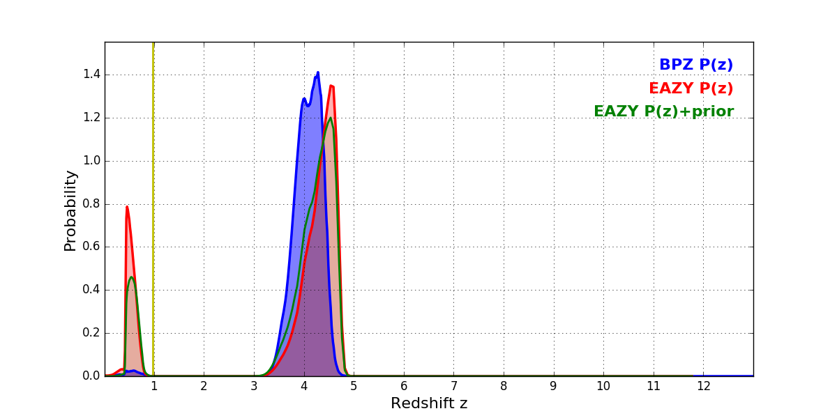 In P(z) plots: Yellow lines mark the cluster redshift z = 0.972,