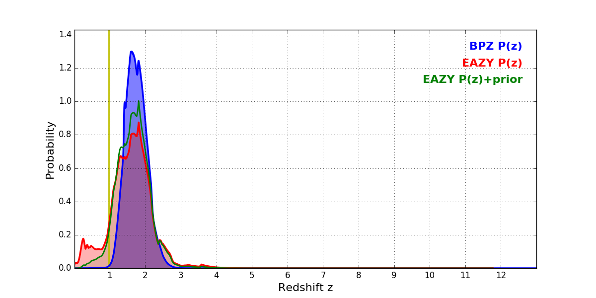 In P(z) plots: Yellow lines mark the cluster redshift z = 0.972,