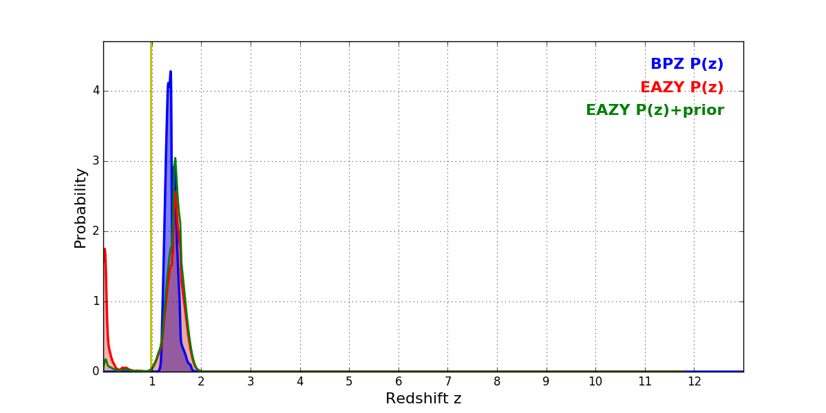 In P(z) plots: Yellow lines mark the cluster redshift z = 0.972,