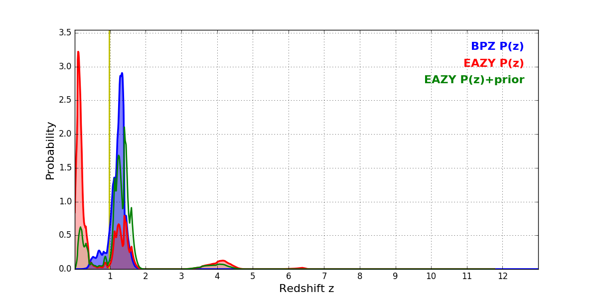 In P(z) plots: Yellow lines mark the cluster redshift z = 0.972,