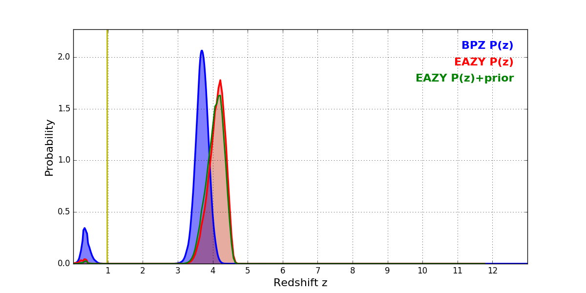In P(z) plots: Yellow lines mark the cluster redshift z = 0.972,