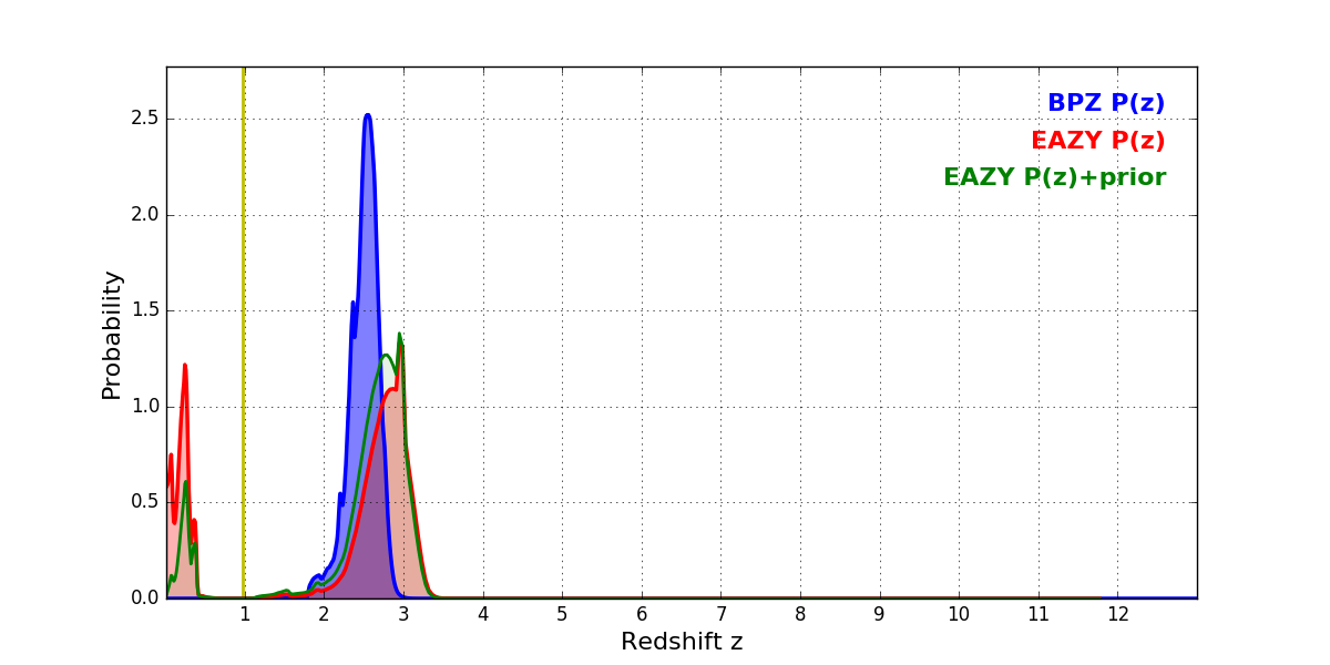 In P(z) plots: Yellow lines mark the cluster redshift z = 0.972,