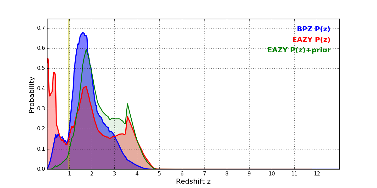 In P(z) plots: Yellow lines mark the cluster redshift z = 0.972,