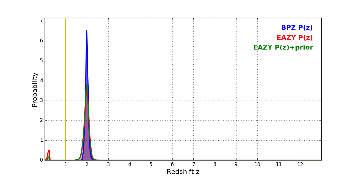 In P(z) plots: Yellow lines mark the cluster redshift z = 0.972,