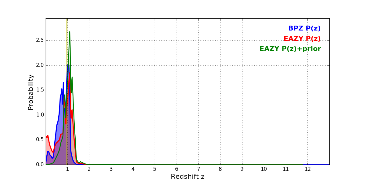 In P(z) plots: Yellow lines mark the cluster redshift z = 0.972,