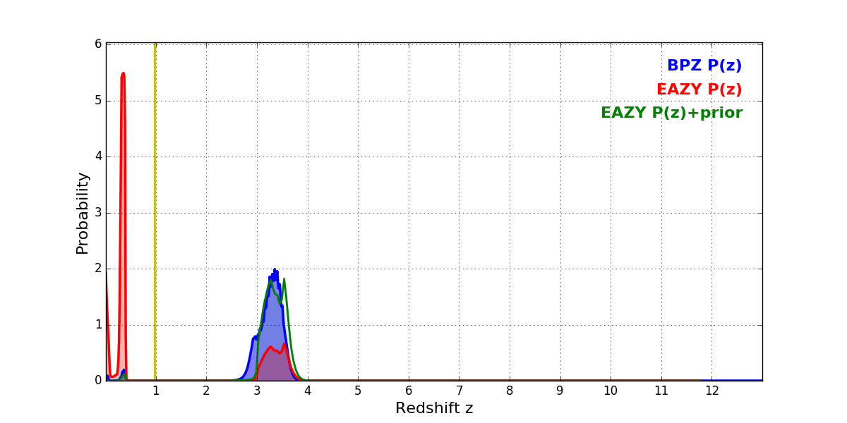 In P(z) plots: Yellow lines mark the cluster redshift z = 0.972,