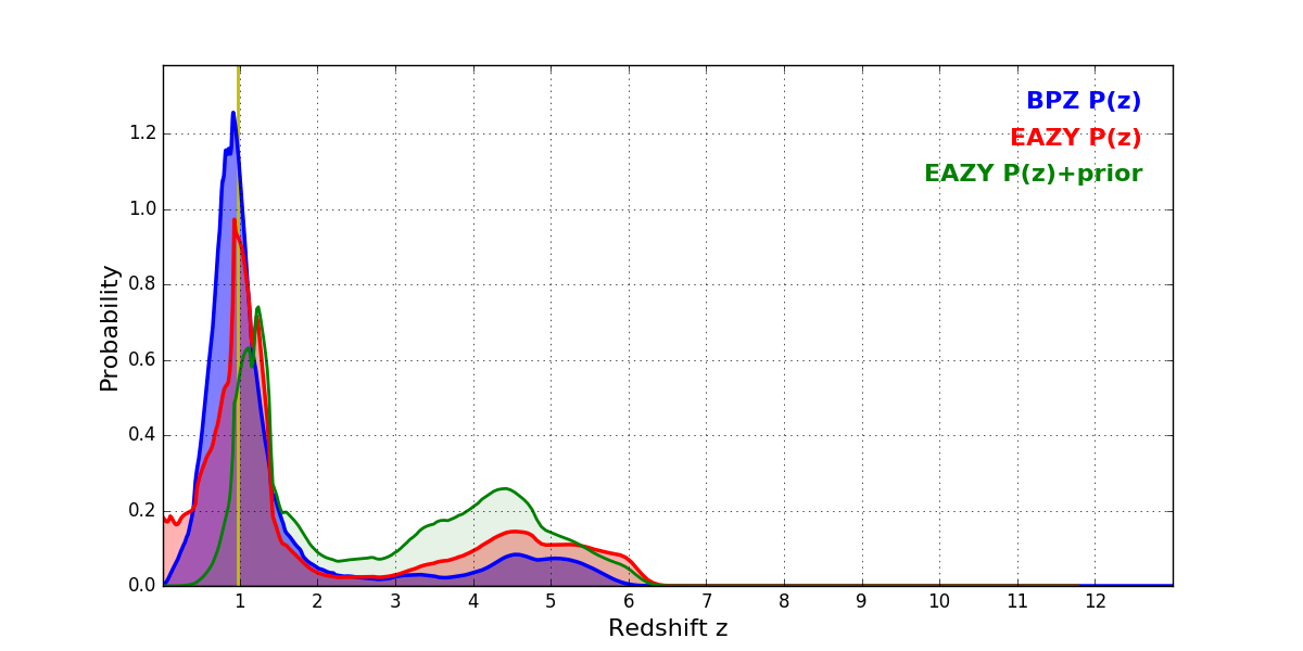 In P(z) plots: Yellow lines mark the cluster redshift z = 0.972,