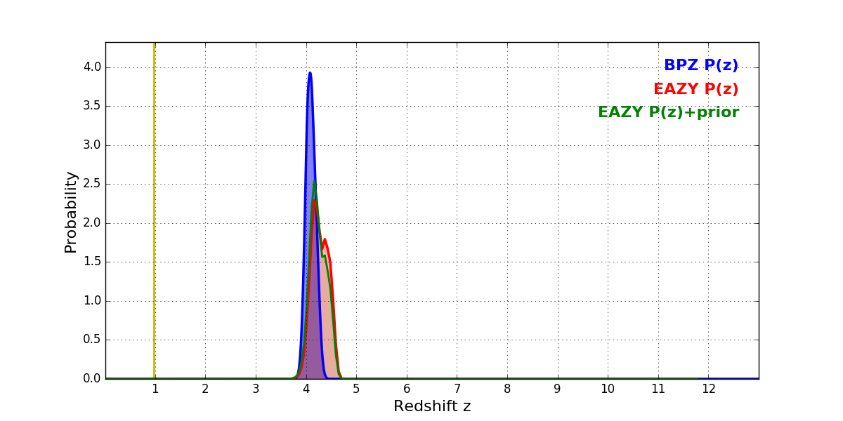 In P(z) plots: Yellow lines mark the cluster redshift z = 0.972,