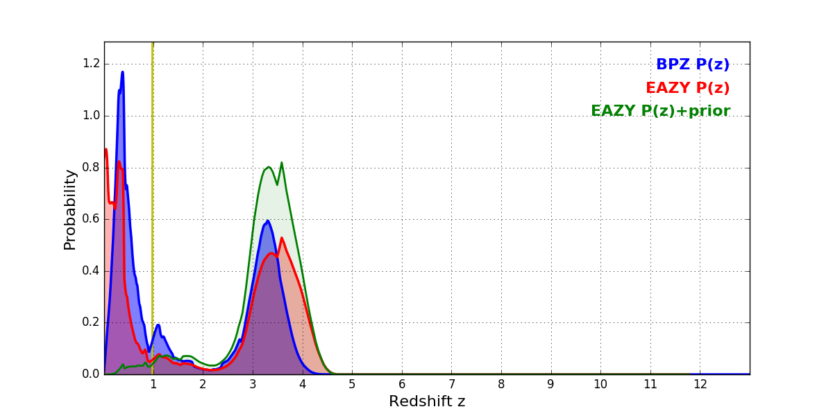 In P(z) plots: Yellow lines mark the cluster redshift z = 0.972,