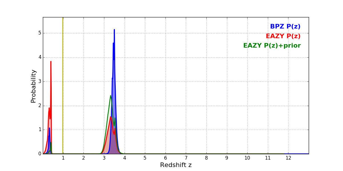 In P(z) plots: Yellow lines mark the cluster redshift z = 0.972,