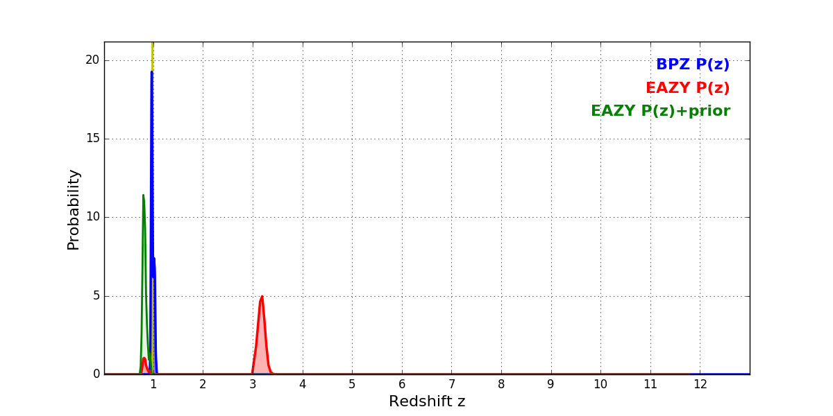 In P(z) plots: Yellow lines mark the cluster redshift z = 0.972,