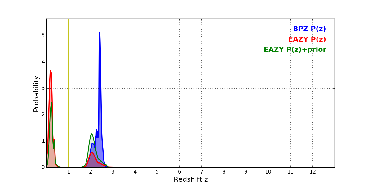In P(z) plots: Yellow lines mark the cluster redshift z = 0.972,