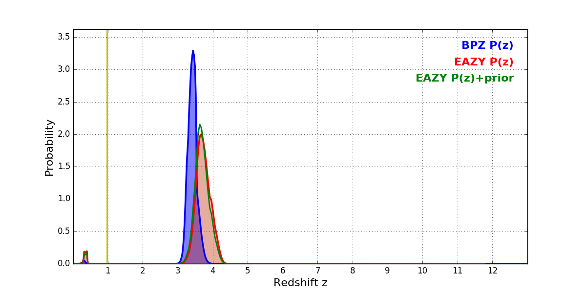 In P(z) plots: Yellow lines mark the cluster redshift z = 0.972,
