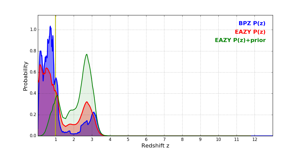 In P(z) plots: Yellow lines mark the cluster redshift z = 0.972,