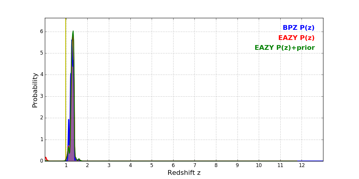 In P(z) plots: Yellow lines mark the cluster redshift z = 0.972,