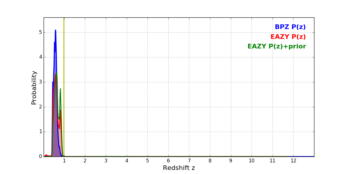 In P(z) plots: Yellow lines mark the cluster redshift z = 0.972,