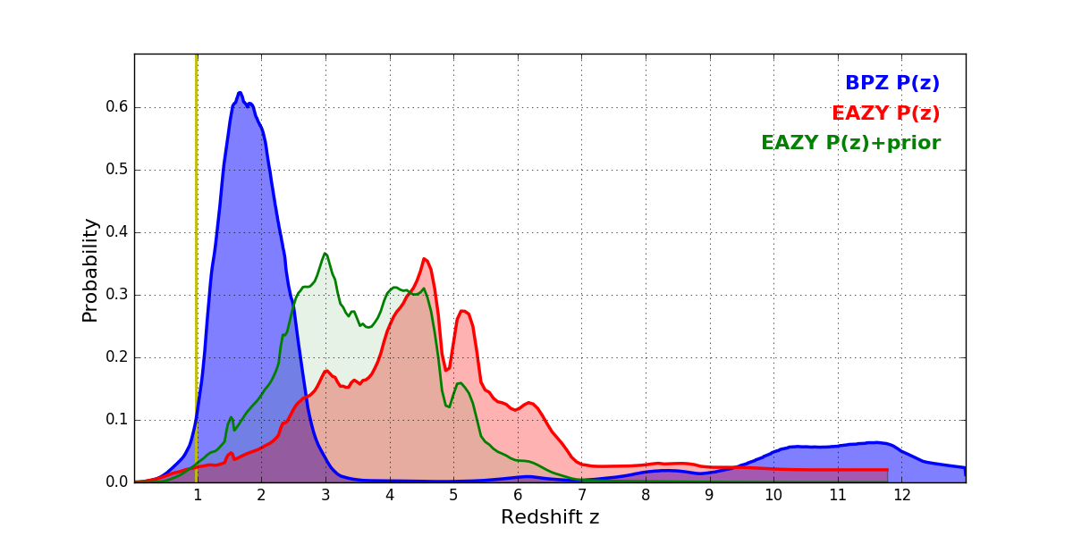 In P(z) plots: Yellow lines mark the cluster redshift z = 0.972,