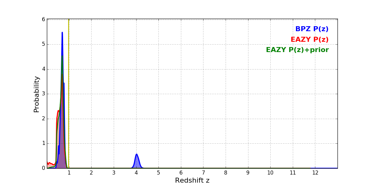 In P(z) plots: Yellow lines mark the cluster redshift z = 0.972,