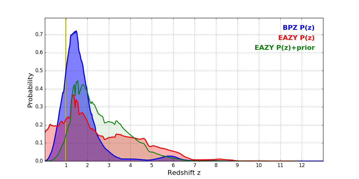In P(z) plots: Yellow lines mark the cluster redshift z = 0.972,