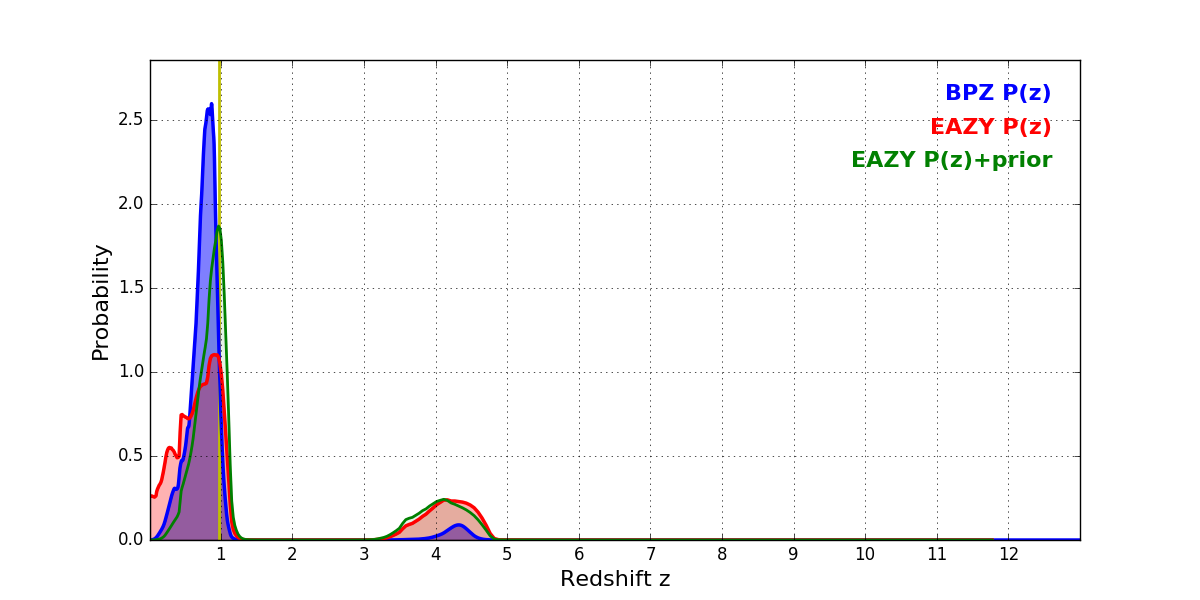 In P(z) plots: Yellow lines mark the cluster redshift z = 0.972,